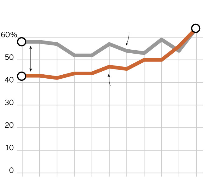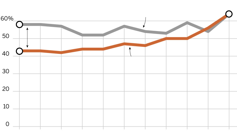 Black students graduated at the same rate as white students in 2016. For many years, there was a gap between the graduation rates for black and white students.